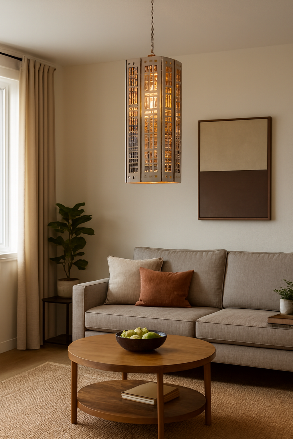 Transform your space with the Geometric Glow Pendant Lamp, a stunning fusion of modern design and artisanal craftsmanship. Featuring a laser-cut wooden shade with intricate maze-like patterns, this fixture casts mesmerizing shadows while delivering a warm, ambient glow. Suspended elegantly above your living area, it becomes an instant focal point that elevates any interior.